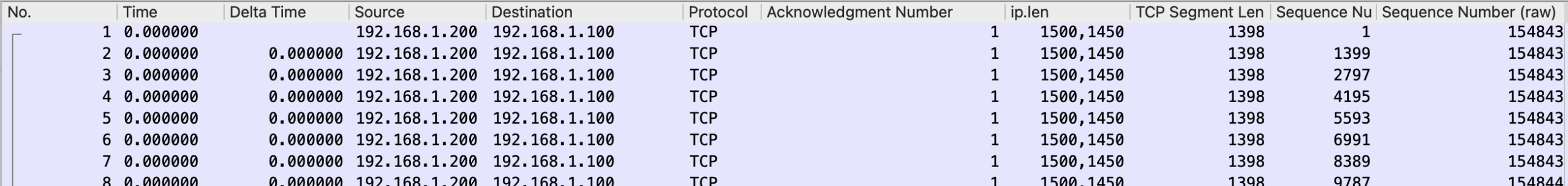 打开这个抓包文件,可以马上确认这是一个发送的数据比较多的连接1,因为 TCP sequence number 上升的很快,IP 层的包都是用最大的 MTU 发送的。