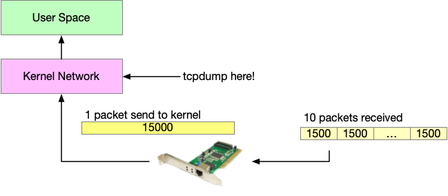 之前的一篇有关 MTU 的讨论2,我们知道,发送超过 MTU 的包是会被其他的设备丢弃的,那么为什么我们从 tcpdump 能看到超过 MTU 的包呢?这是因为网卡帮我们把收到的多个小包给合并成了一个大包,再交给操作系统(Kernel)处理,这部分现在一般是在网卡的硬件上来完成的,所以我们抓包看到的(即操作系统看到的)是网卡合并处理之后的包。这叫做 Large Receive Offload,LRO。