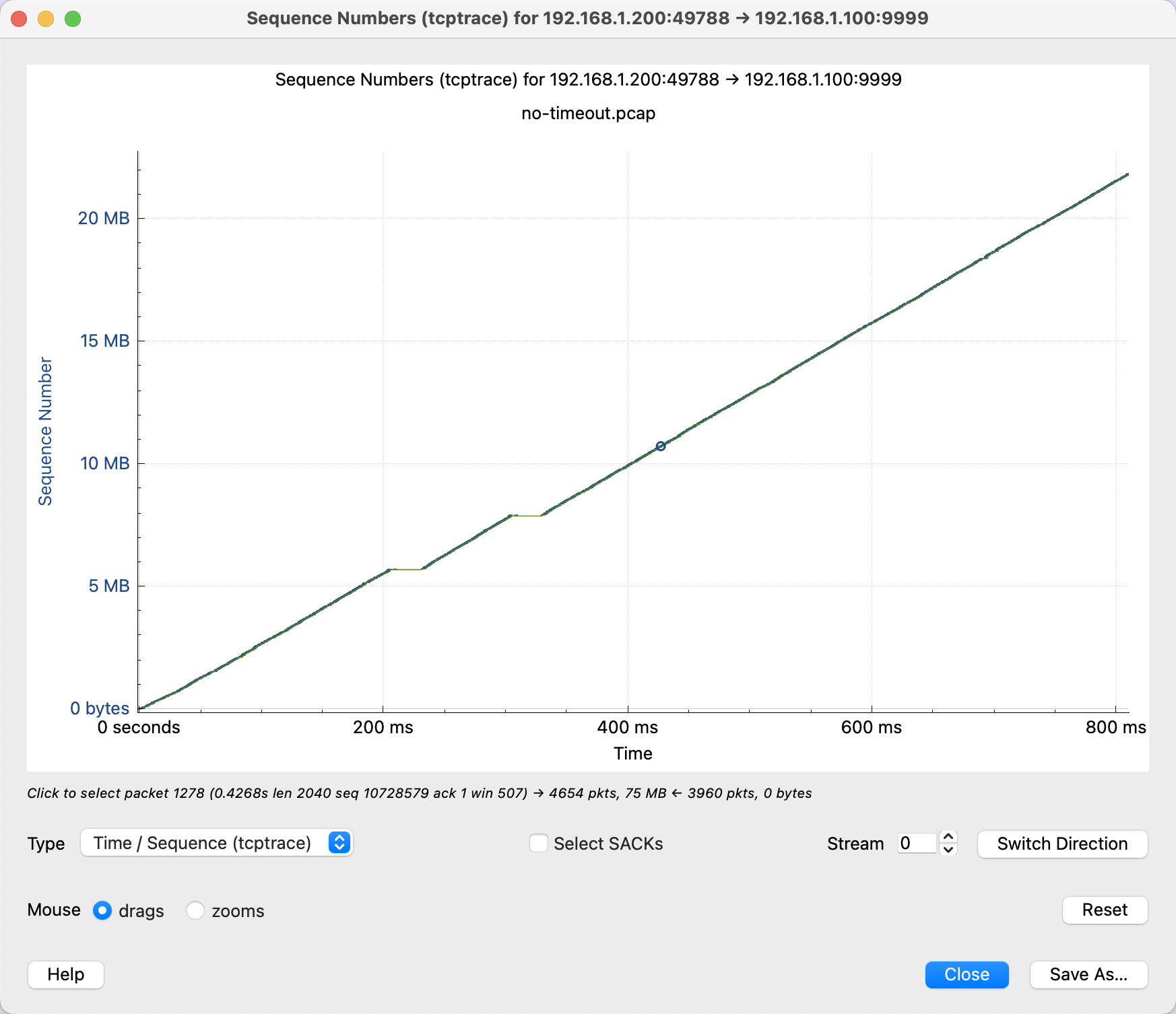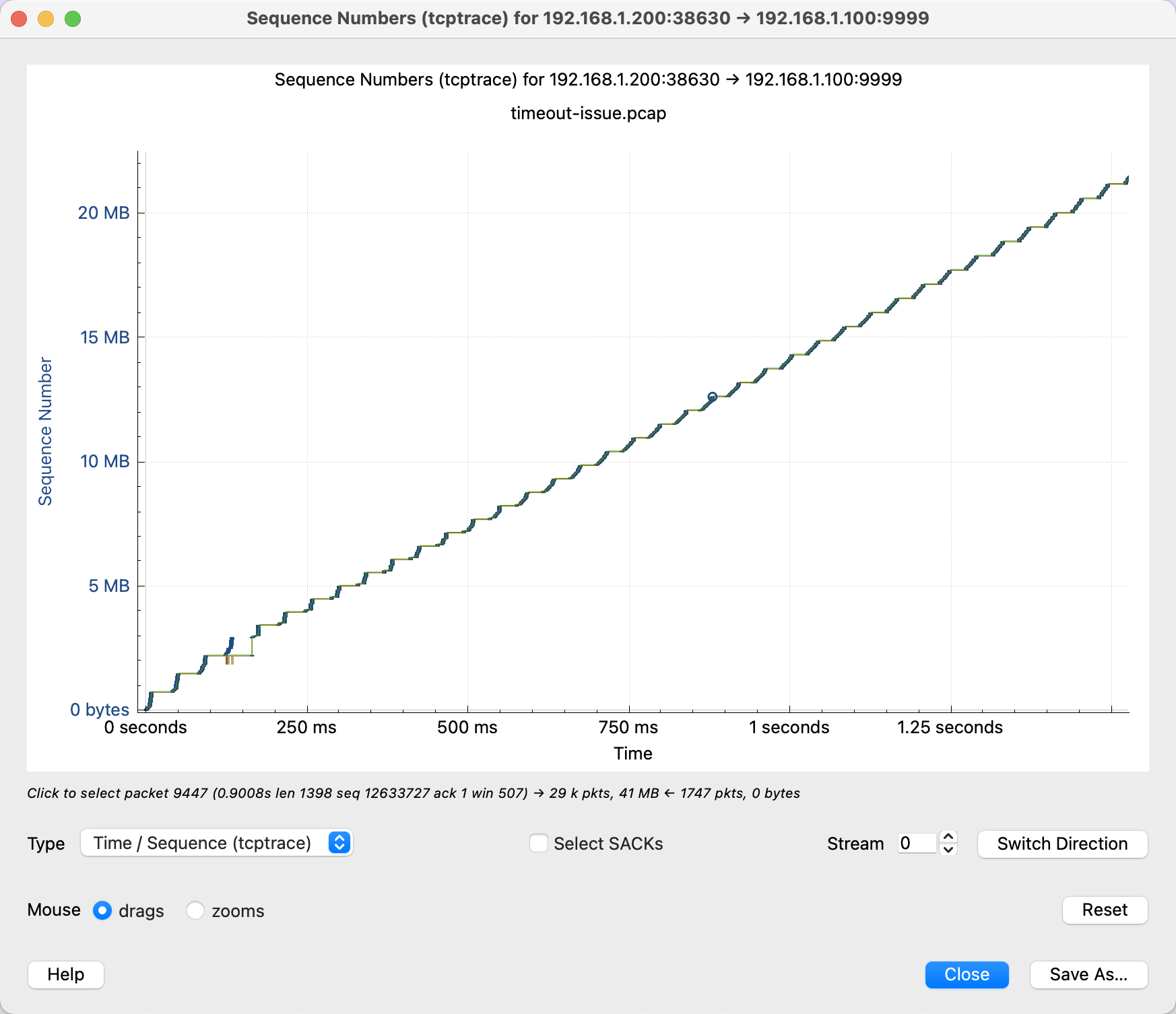 由于没有抓到这个 stream 的 TCP 3次卧手包,我们不知道 window scaling 是多少,所以这条绿线就可以直接忽略了。剩余的看起来一点问题没有,cwnd 打开并且保持的很好,也没有很多 SACK。在 200ms 左右有一次丢包。但是看 sequence 上涨的趋势来说,并没有造成多大的影响,很快补回来了。所以这里不是主要原因。