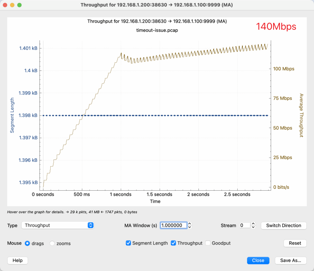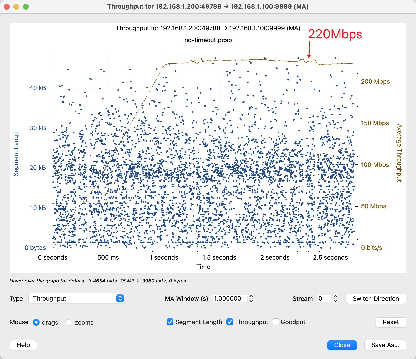 棕色的线对应实际的传输速率(右侧的 Y 轴)。可以看到,正常情况下吞吐可以达到 220Mbps 左右,但是换上新的设备只有 140Mbps 左右。在大部分 HTTP 请求中,对于小的包,延迟的变化不会特别大,但是在长肥管道中,吞吐低就会造成传输数据就会出现差距。导致部分请求超时。